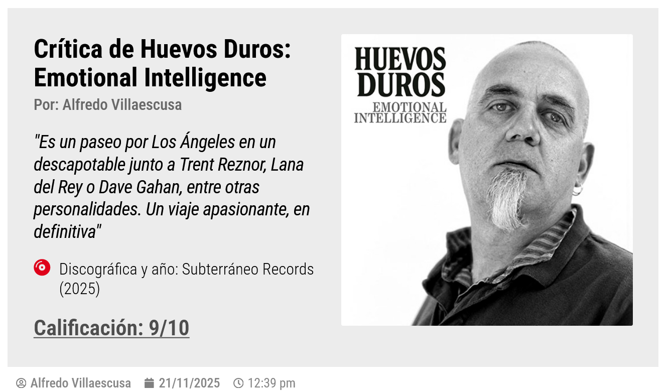 Lo cierto es que Emotional Intelligence de Huevos Duros está siendo muy bien acogido por los medios especializados. Aquí te dejamos algunos enlaces por si te apetece visitarlos y conocer un poco más este proyecto de Manolo Rock. Ahí vamos. El gran César Campoy publica un excelente artículo, a la altura del que sabe de que escribe, en la prestigiosa revista digital EfeEme. Alfredo Villaescusa, en MariskalRock, le planta un 9 de 10 a Emotional Intelligence y, encima, se marca un análisis de los que da gusto leer: lo desgrana de arriba abajo, levanta la alfombra, pasa la escoba y no deja escapar ni un mísero detalle. Jon Marín, director de Los Mejores Rock, ametralla a Manolo, sin compasión, con balas de maldad y felicidad en una extensa "entrevista loca". Y el bueno de Carlos Ciurana le da un repasito al disco desde su portal Los Pilotos Suicidas, al cual estás más que invitado. Esto solo es un botón de muestra de lo que se cuece por ahí.